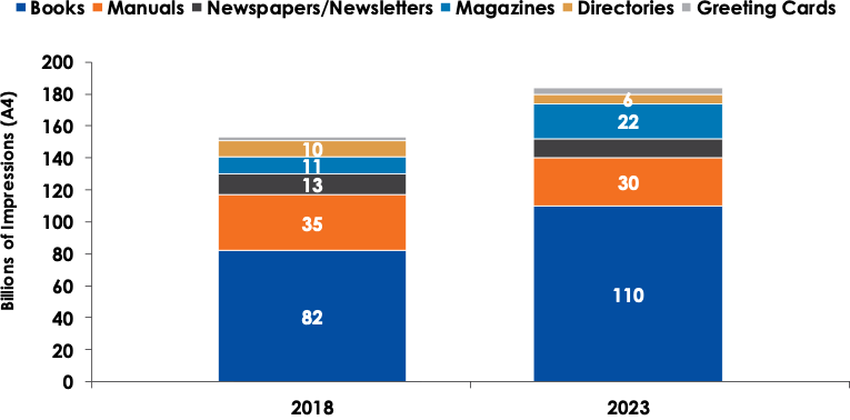 The demand for printed books remains strong. Book publishers began to witness a capacity gap a few years ago, but this trend has only accelerated with the onset of COVID-19. The traditional publishing market is expected to perform strongly—better than it has in the past 10 years, in fact. The pandemic caused a surge in printed book sales, including traditional books, personalized books, children’s books, and yearbooks. With ongoing advancements in ink sets, print quality, and paper selection, production inkjet presses are well-positioned to support the demanding applications within this market. The trend of shorter run lengths has arrived, and it serves digital book printers well. As illustrated in the figure below, printed books are expected to achieve double-digit growth through 2023.