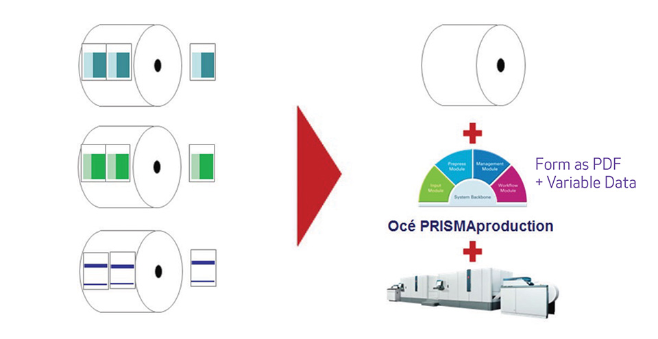 Plain, white paper is used instead of a preprinted form. The information previously contained on the preprinted form is created in electronic form, digitally married with the variable content, and both are printed simultaneously. Using Océ PRISMAproduction® software, the preparation of the forms as well as day-to-day operations are controlled by its Professional Job Manager (PJM).